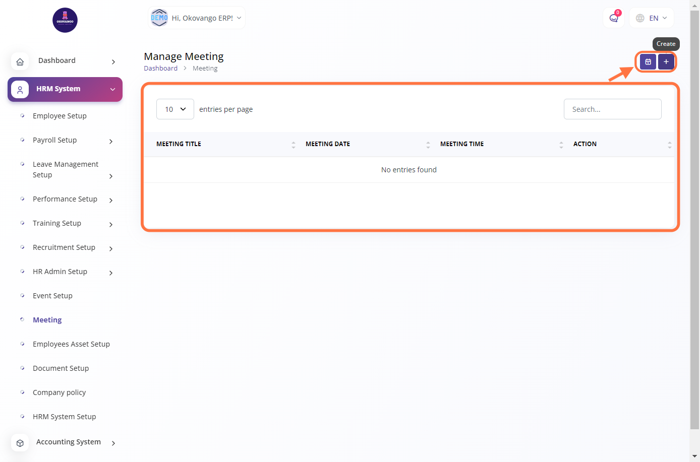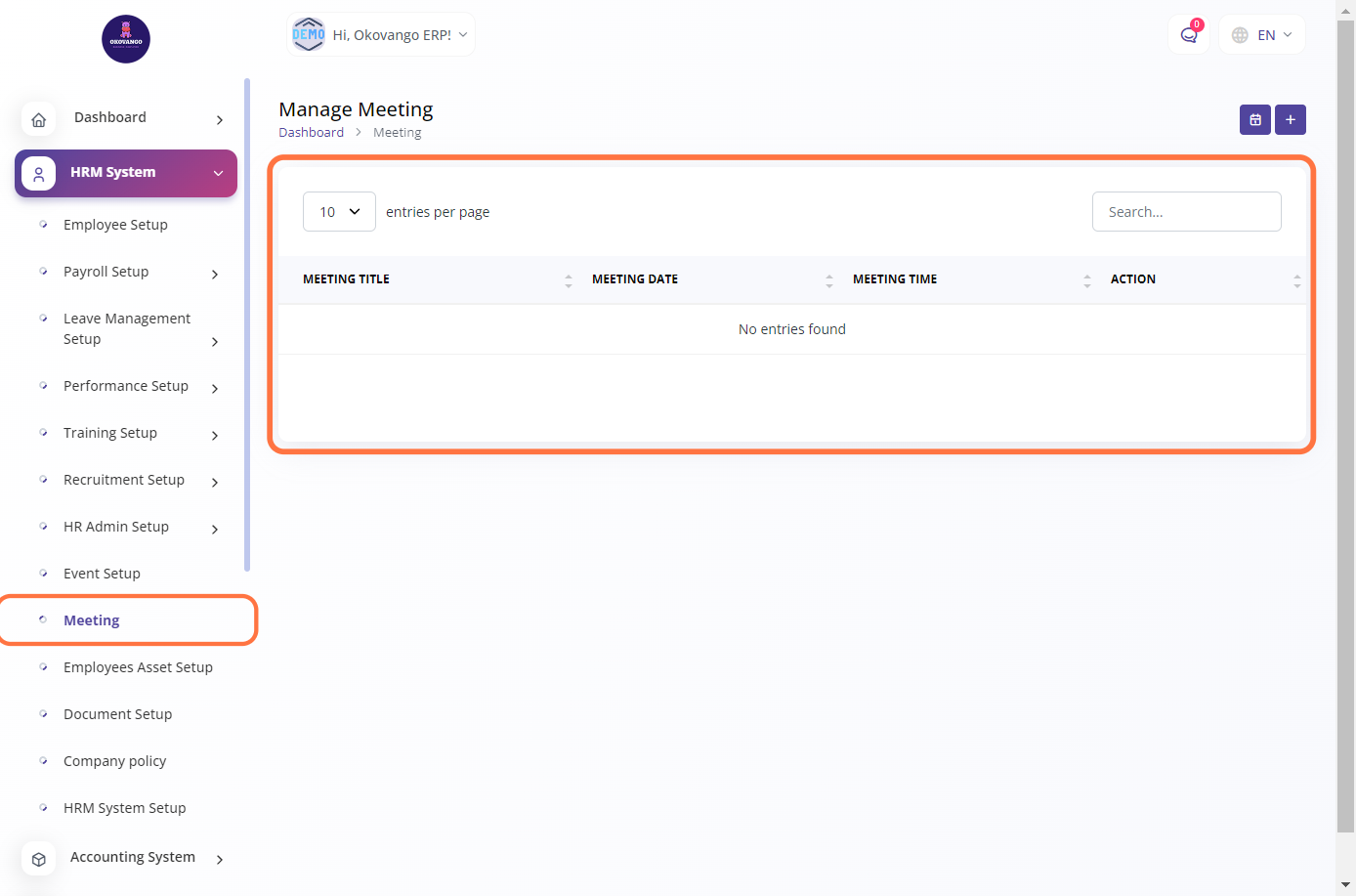 You can manage and organize meetings within your organization. This functionality allows you to schedule, track, and coordinate various meetings, ensuring effective communication and collaboration among team members. You can manage meeting details such as date, time, location, participants, agenda, and any associated documents or resources. Additionally, you may have options to send meeting invitations, track attendance, and record meeting minutes or outcomes. Overall, this feature helps streamline the meeting management process and facilitates efficient collaboration within your organization.