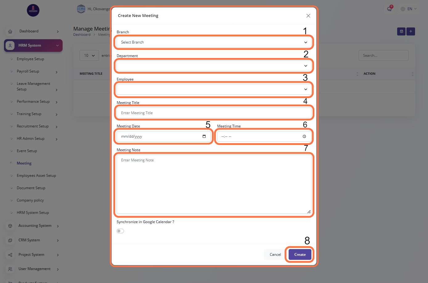 Once you click the create button, you can proceed to set up a meeting using the following steps: