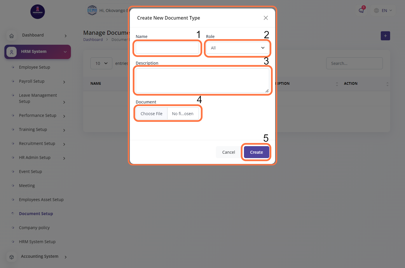 Once you click the create button, you can proceed to set the organization's document using the following steps:
