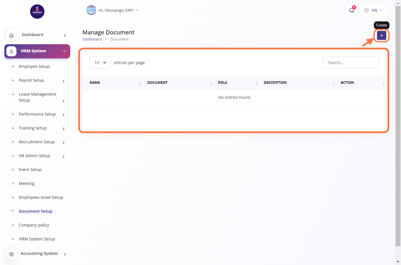 Step 5: Click the create button to finalize the creation of the new document within the organization.