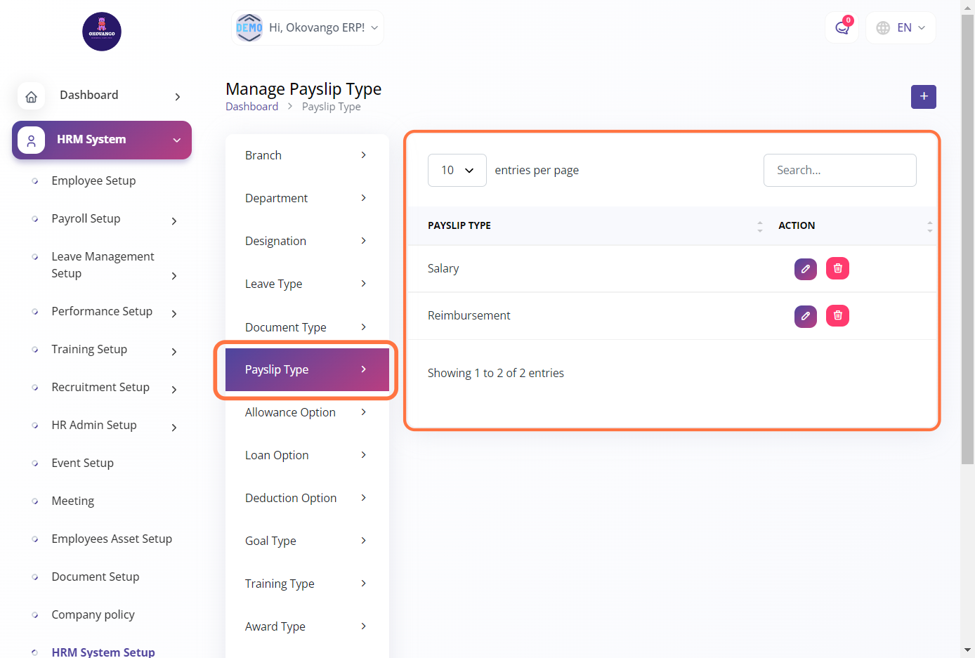 In this section, you can create payslip types specific to your organization, such as salary, reimbursement, or any other applicable categories. This functionality allows you to define and categorize different types of payslips used within your organization. By creating payslip types, you can accurately reflect the various types of compensation and reimbursements provided to employees and effectively manage payslip generation and distribution processes.