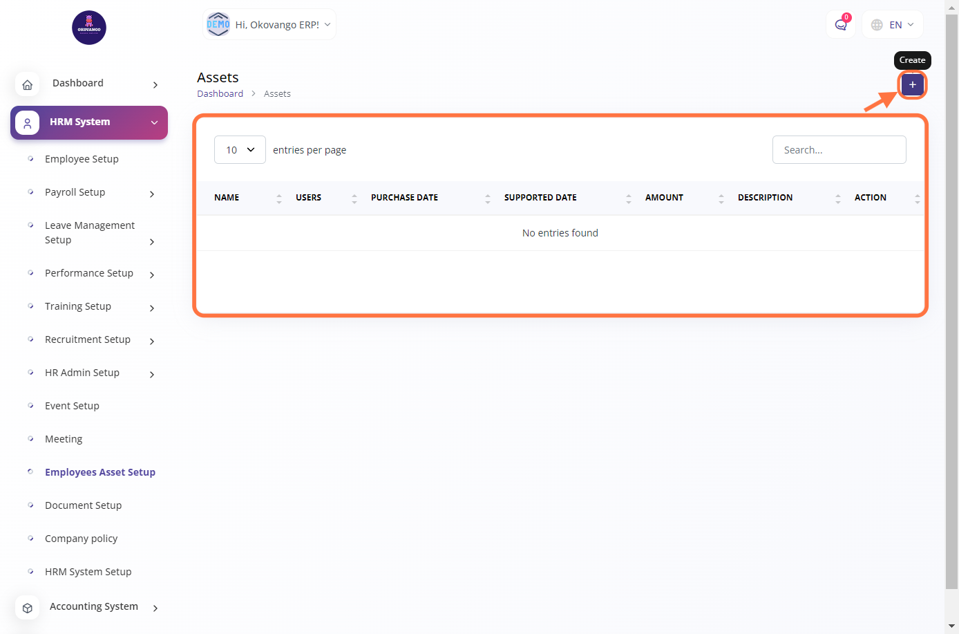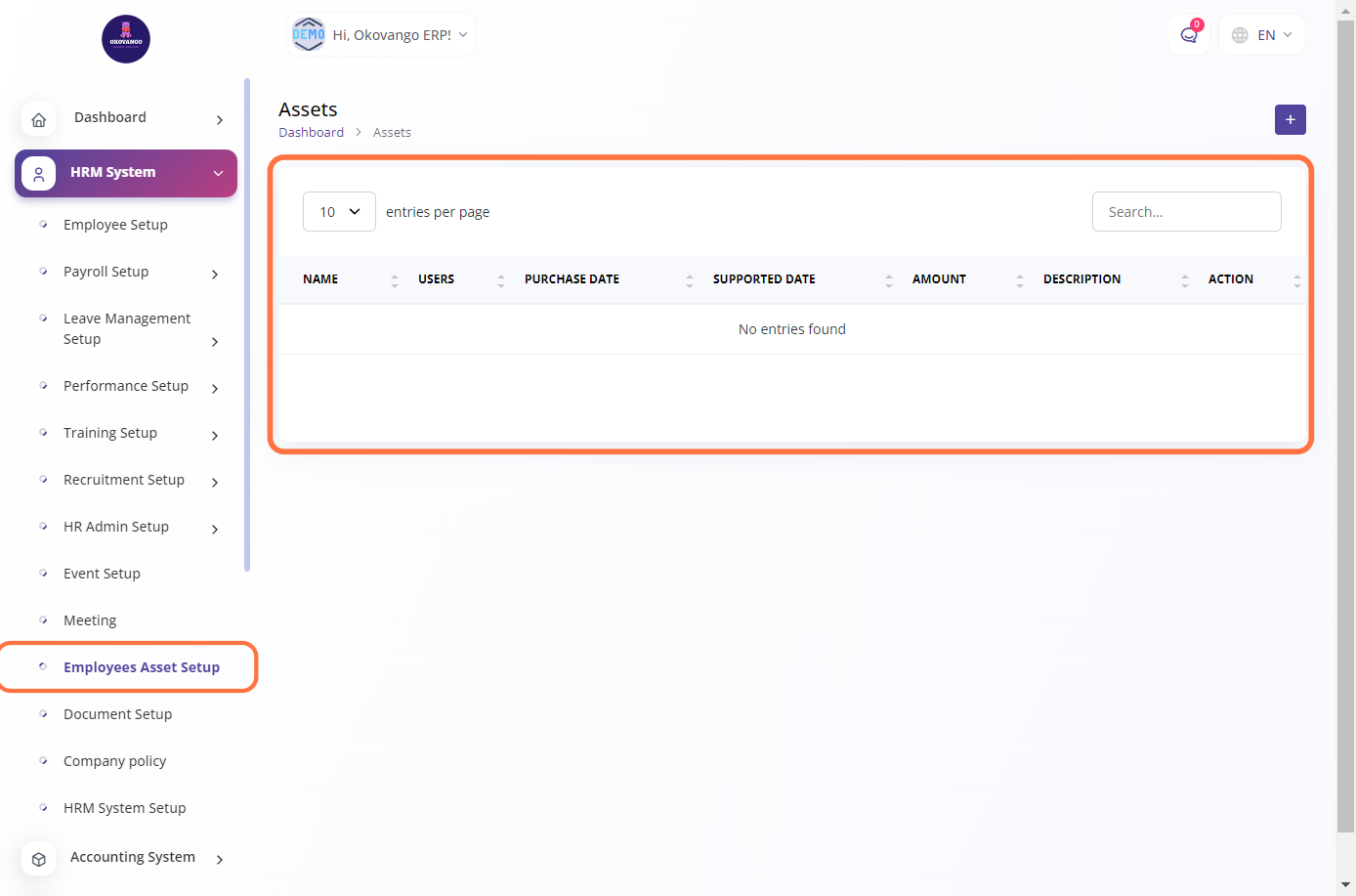 You can set up and manage employee assets within your organization. This functionality allows you to track and assign assets, such as laptops, mobile devices, vehicles, or any other items provided to employees for work purposes. By setting up employee assets, you can efficiently manage the allocation, maintenance, and return of assets, ensuring proper accountability and usage within your organization.
