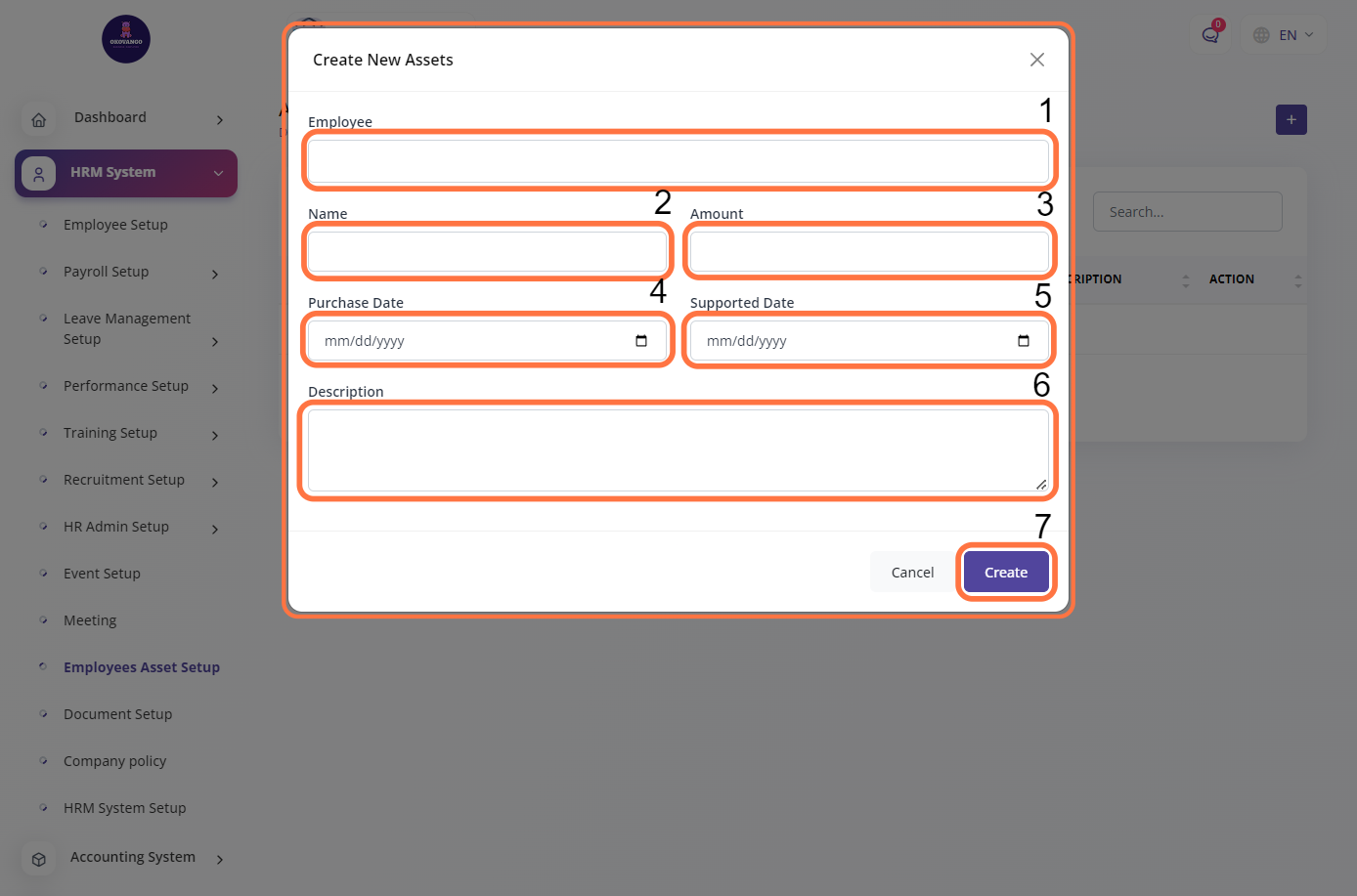 Once you click the create button, you can proceed to set the employee asset using the following steps: