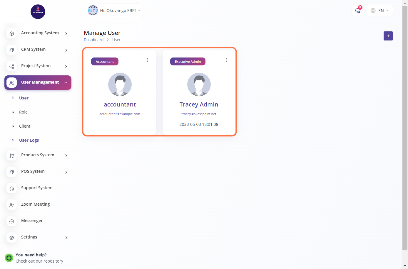 You can create and manage individual user accounts within the ERP system. This includes setting up new user profiles, providing necessary user information such as name and contact details, and assigning unique usernames and passwords for authentication. Additionally, user roles and permissions can be assigned to determine the level of access and privileges each user has within the system. User management allows administrators to efficiently control user accounts and ensure that the right individuals have appropriate access to system resources.