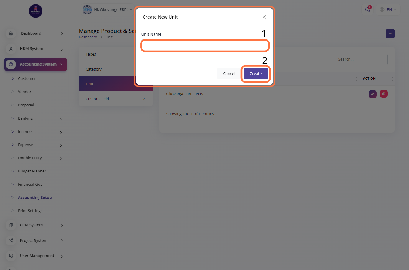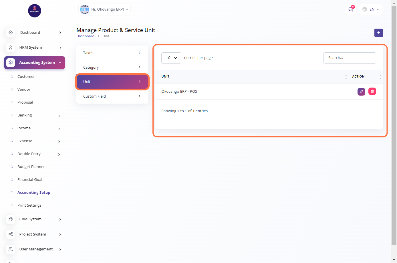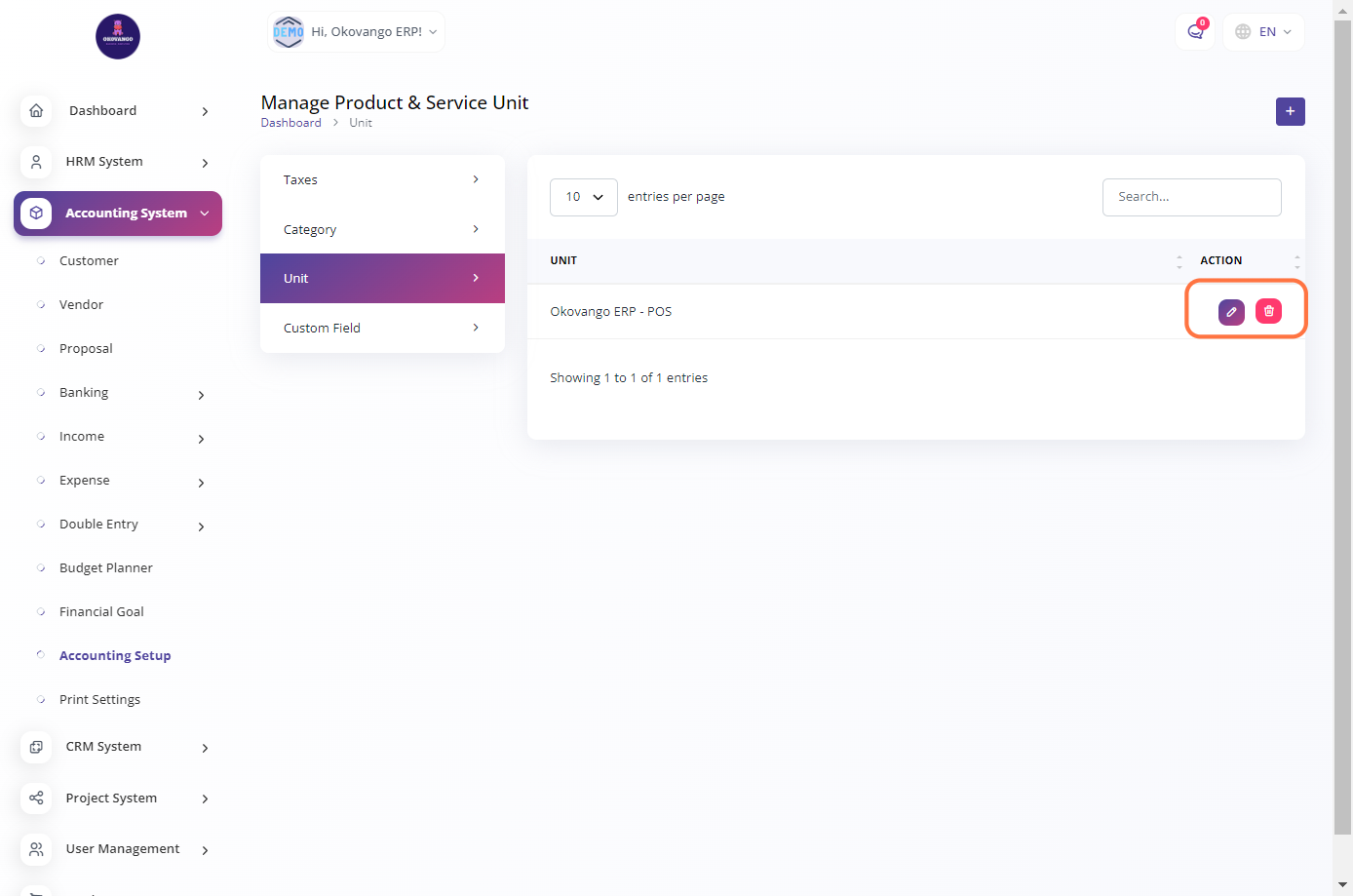 you can create and manage units of quantities for your products or services. This allows you to define and track quantities in a standardized manner. You can set up units by providing a unit name and an optional description. Additionally, you have the flexibility to edit or delete existing units as needed to align with your business requirements.