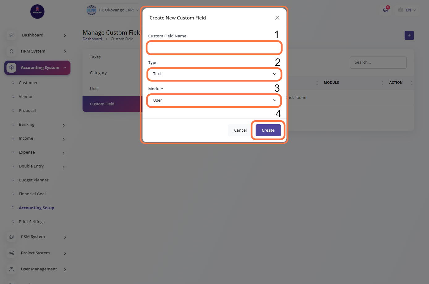 Once you click the create button, you can proceed to set up a custom field in the accounting system using the following steps: