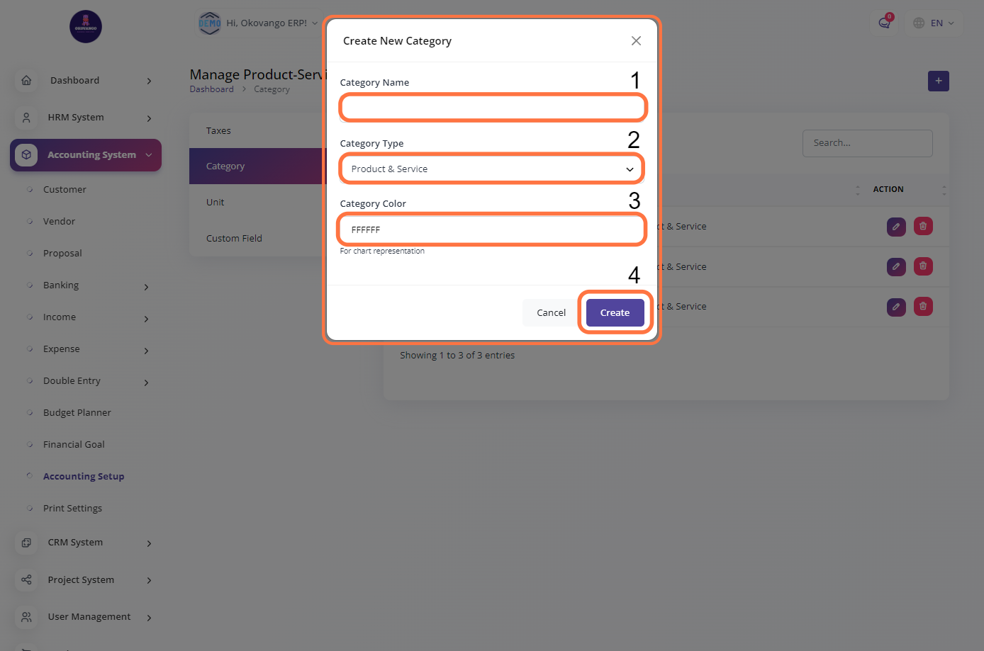 After clicking the create button, you can proceed to set up a category in the accounting system using the following steps: