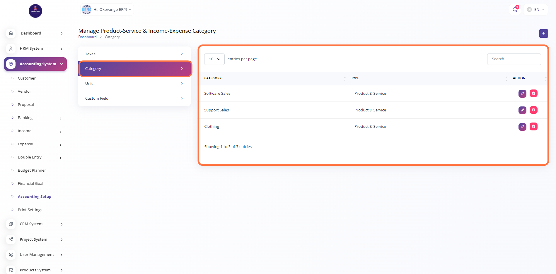 You have the option to edit and delete categories in the accounting system. Editing allows you to modify the name, type, and color of a category, while deletion removes the category and its associated transactions. Managing categories provides flexibility in organizing and maintaining accurate financial records.