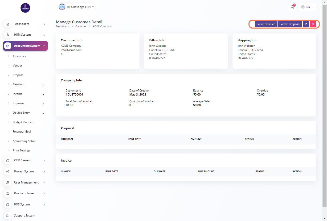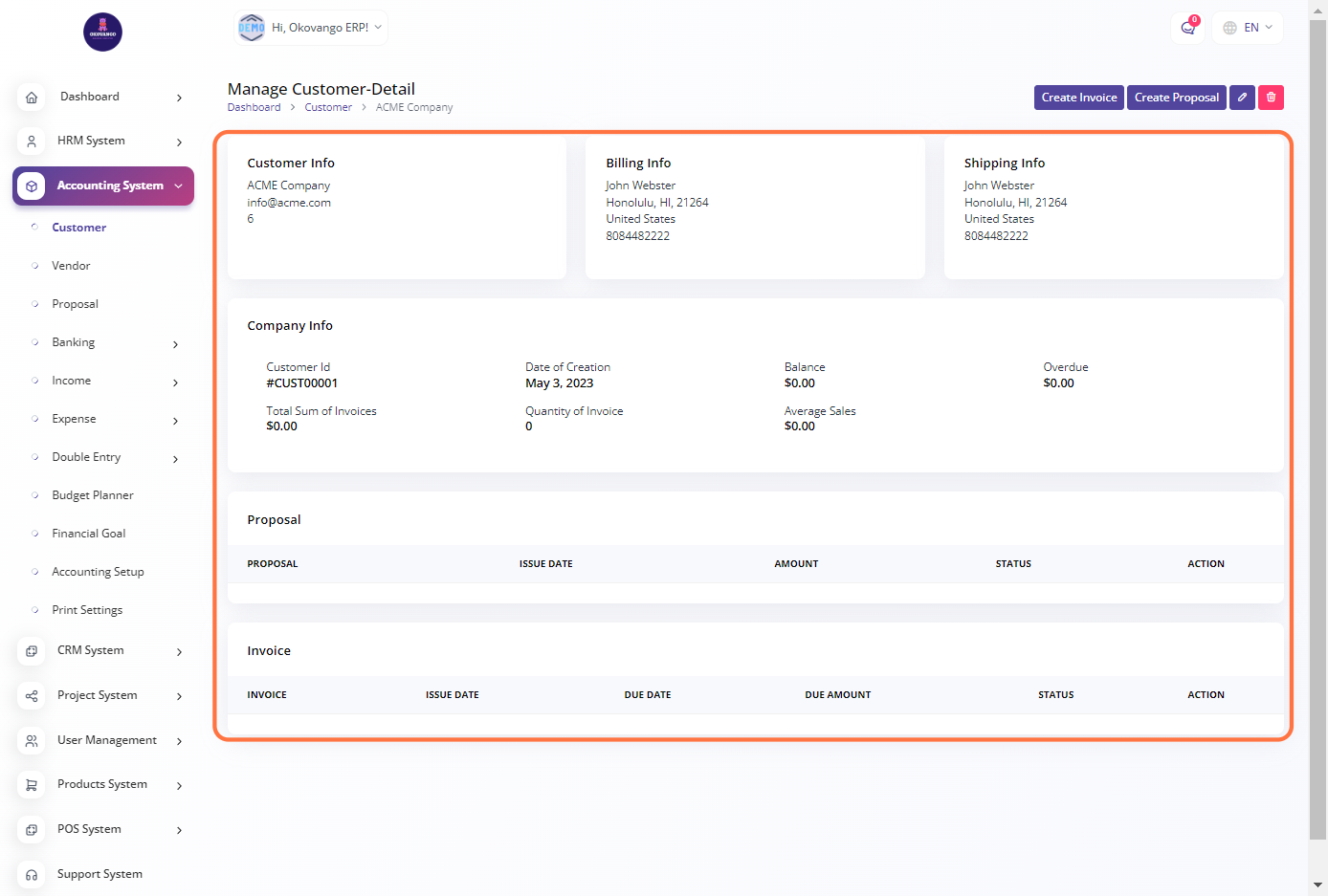 Furthermore, you can access and view any proposals or invoices that are associated with the customer. This allows you to review and track the financial transactions and interactions with the customer. By having access to these details, you can easily manage and monitor the customer's activities and financial history within the accounting system.