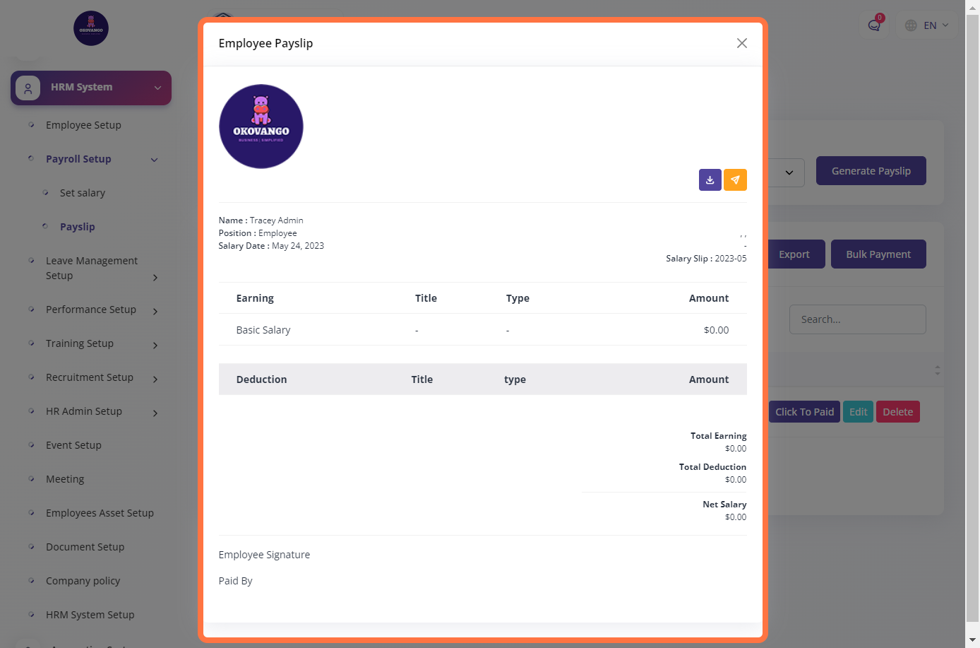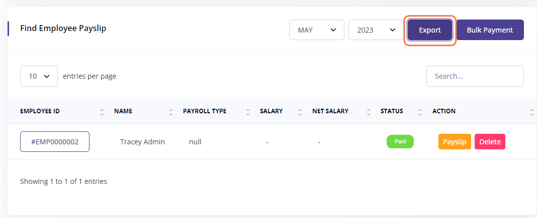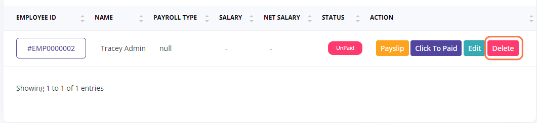 Delete: If needed, you can click the "Delete" button to remove the generated payslip for the employee. This action should be used with caution and only in situations where it is necessary to remove the payslip entirely from the system.