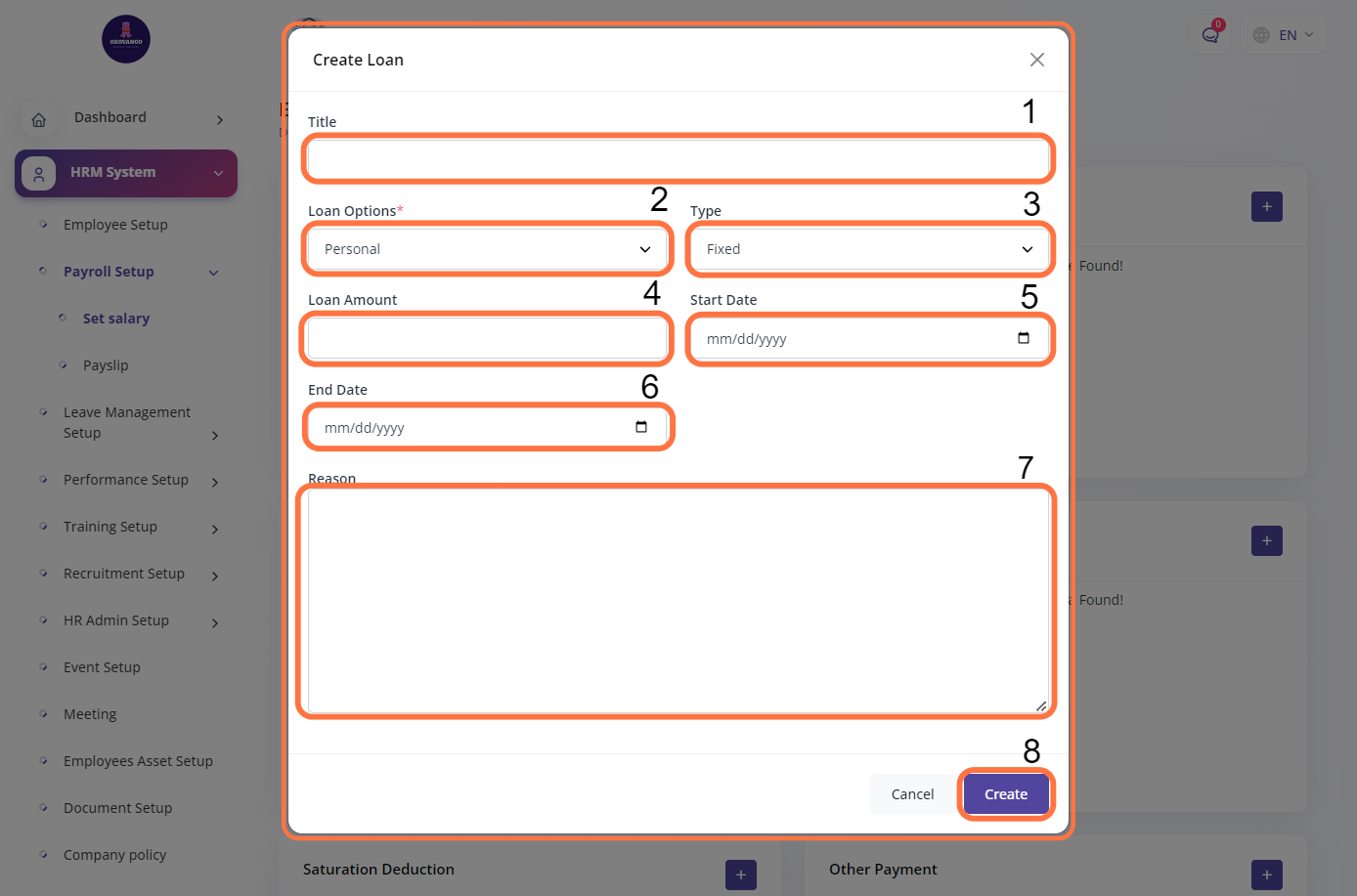 After clicking the create button, you can proceed to set up a loan by following these steps: