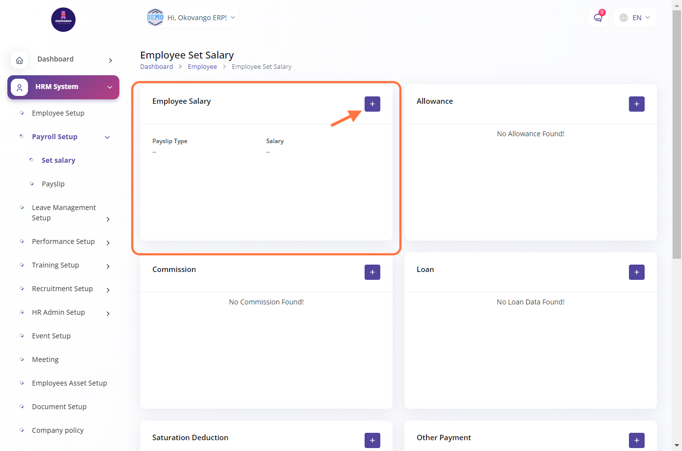 In this section, you can set up employee salaries within the ERP system. Salary setup involves defining the salary structure, components, and calculations for each employee. You can configure salary scales, grades, and levels based on organizational policies and job roles. This includes determining base salary, allowances, bonuses, and deductions. Salary components such as basic pay, overtime, incentives, and benefits can be specified. By setting up employee salaries, the ERP system ensures accurate and consistent salary calculations, facilitates payroll processing, and provides transparency in employee compensation.