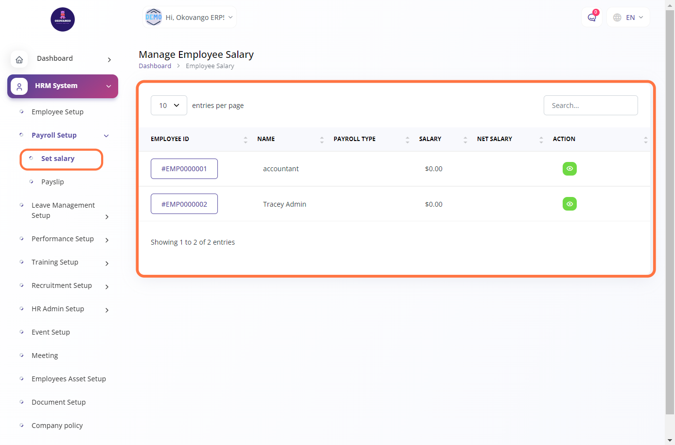 In this section, you can set up employee payroll within the ERP system. Payroll setup involves configuring various components related to employee compensation and benefits. You can define payroll policies, such as salary structures, tax deductions, allowances, and deductions. Additionally, you can specify payment frequencies, such as monthly or bi-weekly, and define payroll periods. Employee payroll information, such as salary details, tax information, and bank account details, can be entered and maintained in the system. Payroll setup ensures accurate and timely processing of employee salaries, tax calculations, and other payroll-related activities. It enables organizations to automate payroll processes, generate payroll reports, and ensure compliance with legal and regulatory requirements.