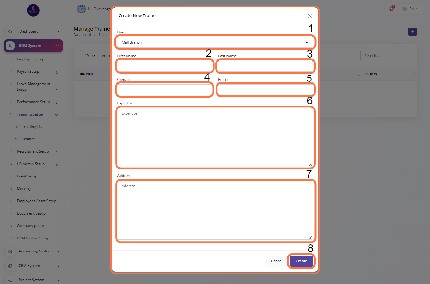 After clicking the create button, you can proceed to set up a trainer by following these steps: