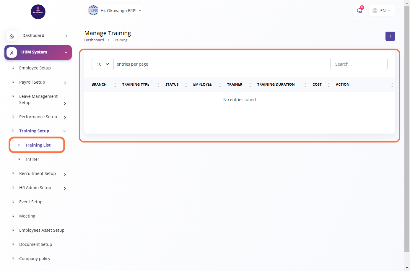 You can set up training programs for employees, including training lists and trainers. You can create a training list to define the specific training courses or programs available within your organization. Additionally, you can assign trainers who will be responsible for delivering the training sessions. This setup ensures that employees have access to the necessary training resources and qualified trainers to enhance their skills and knowledge.