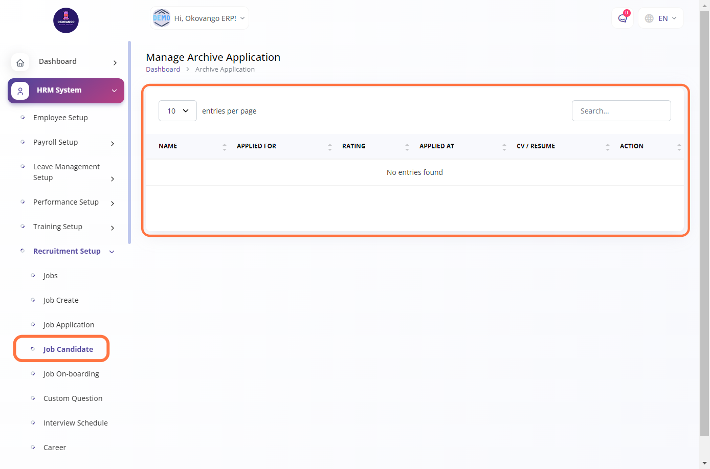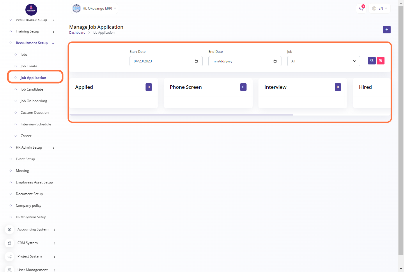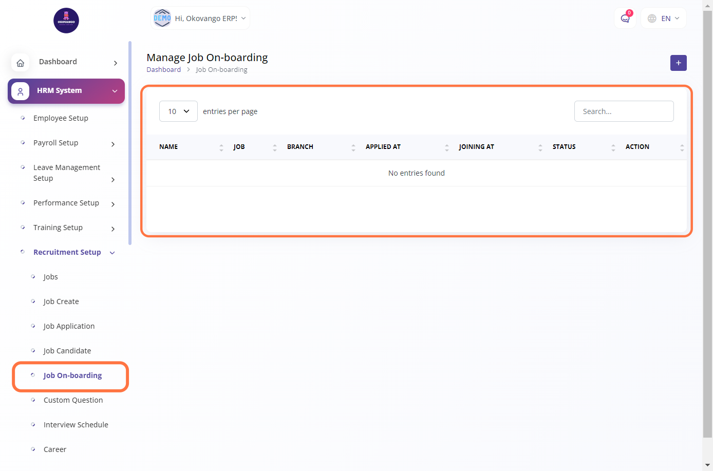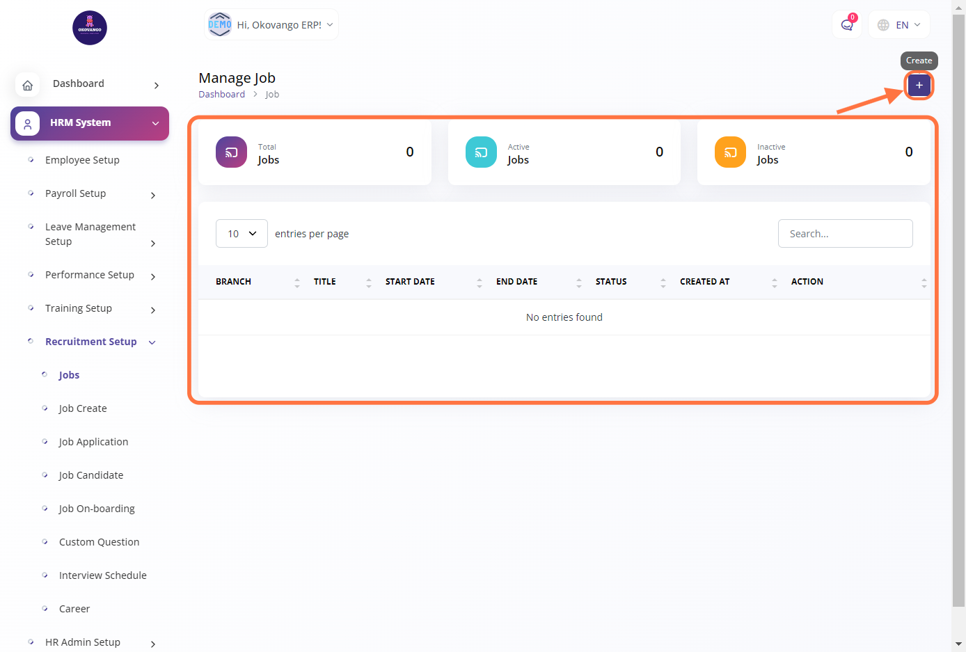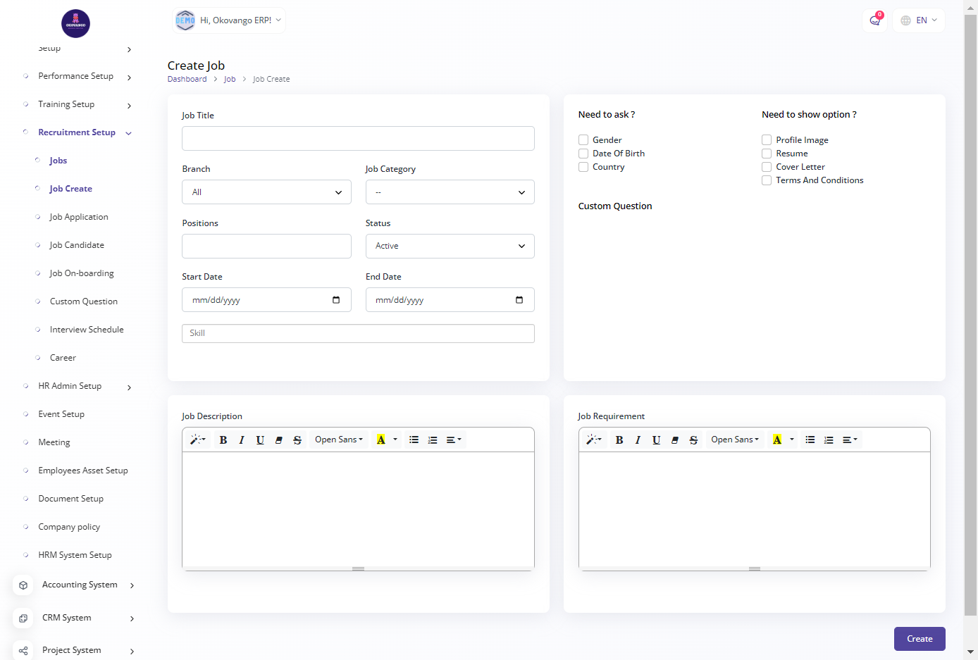 In the recruitment section, you can set up and manage the recruitment process for your organization. This feature allows you to define job positions, create job descriptions, and track the progress of candidates throughout the recruitment process. You can enter details such as jobs, job create, job application, job candidate, job on-boarding, custom question, interview schedule and career. This helps in attracting and selecting suitable candidates for available positions within your organization.