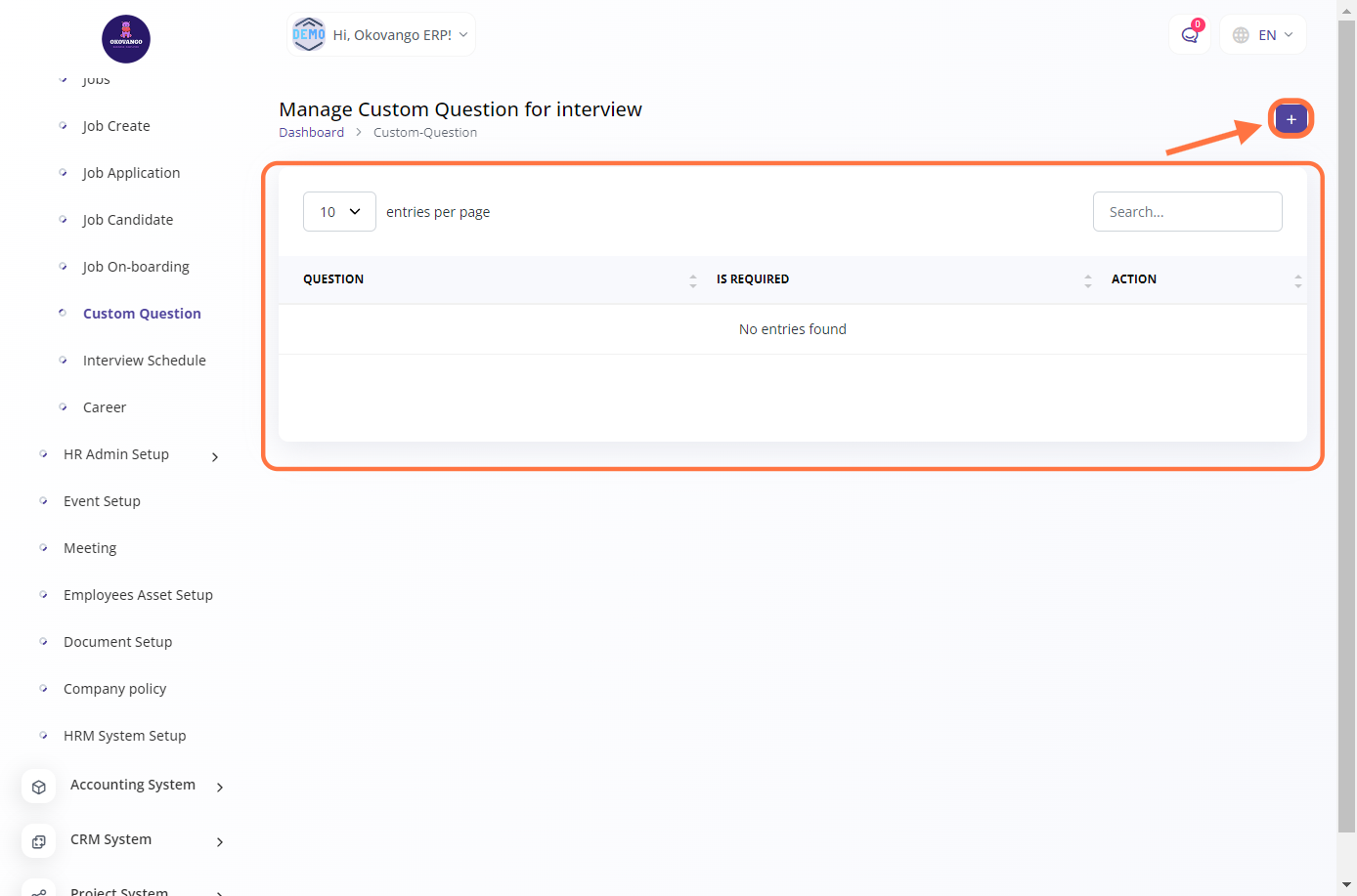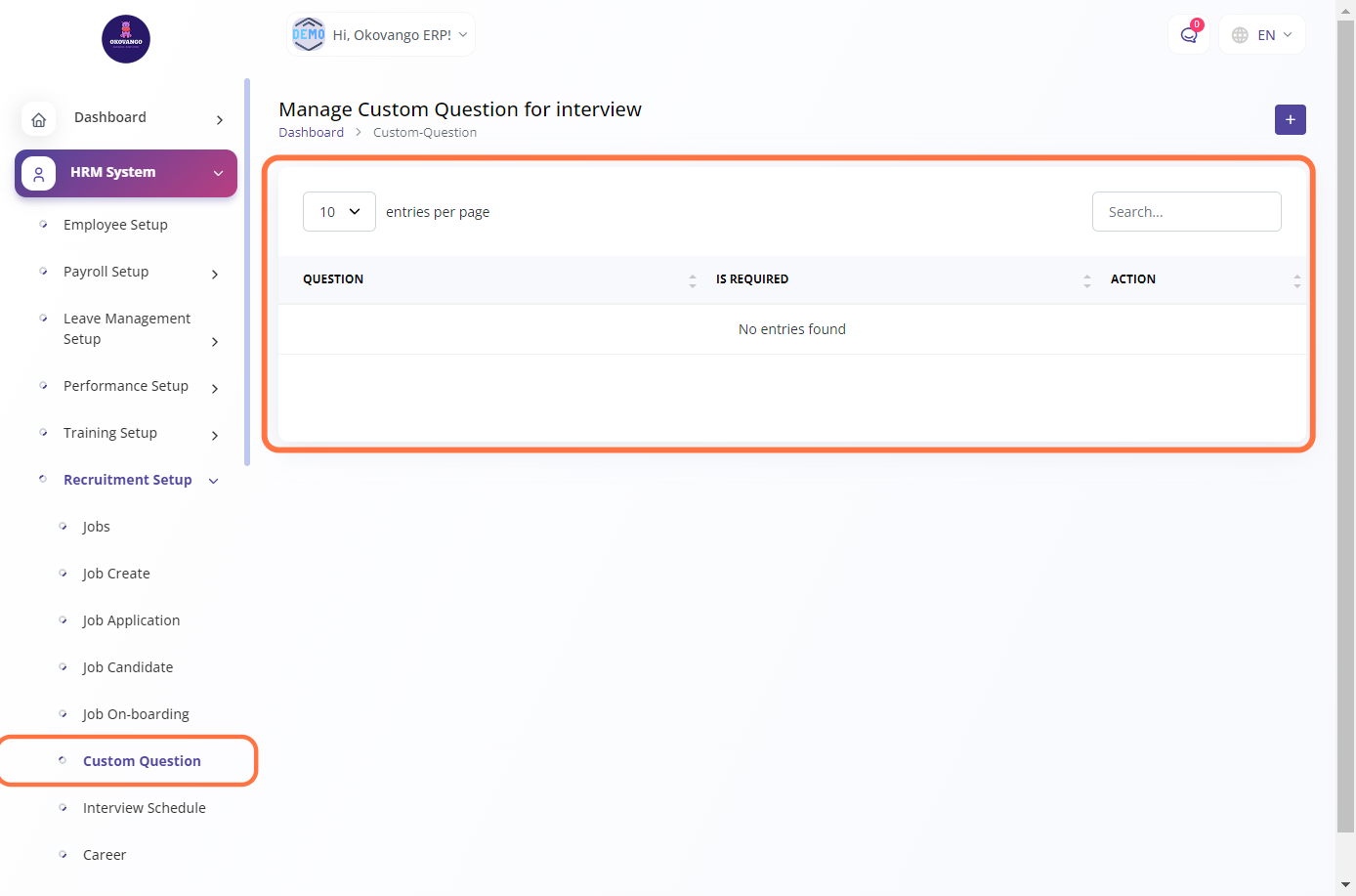 In the custom question setup section, you have the ability to create and customize interview or application questions according to your organization's specific requirements. This feature allows you to tailor the questionnaire to gather the necessary information from job candidates. You can create questions related to skills, qualifications, experience, or any other criteria relevant to the job position. By setting up custom questions, you can effectively evaluate candidates and make informed decisions during the recruitment process.