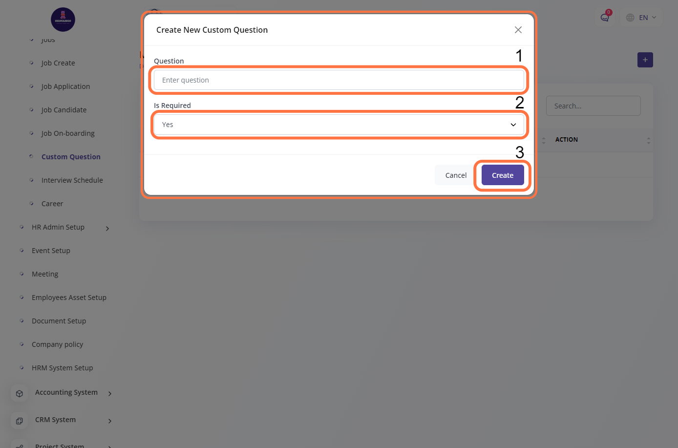 After clicking the create button, you can proceed to set up a custom question by following these steps: