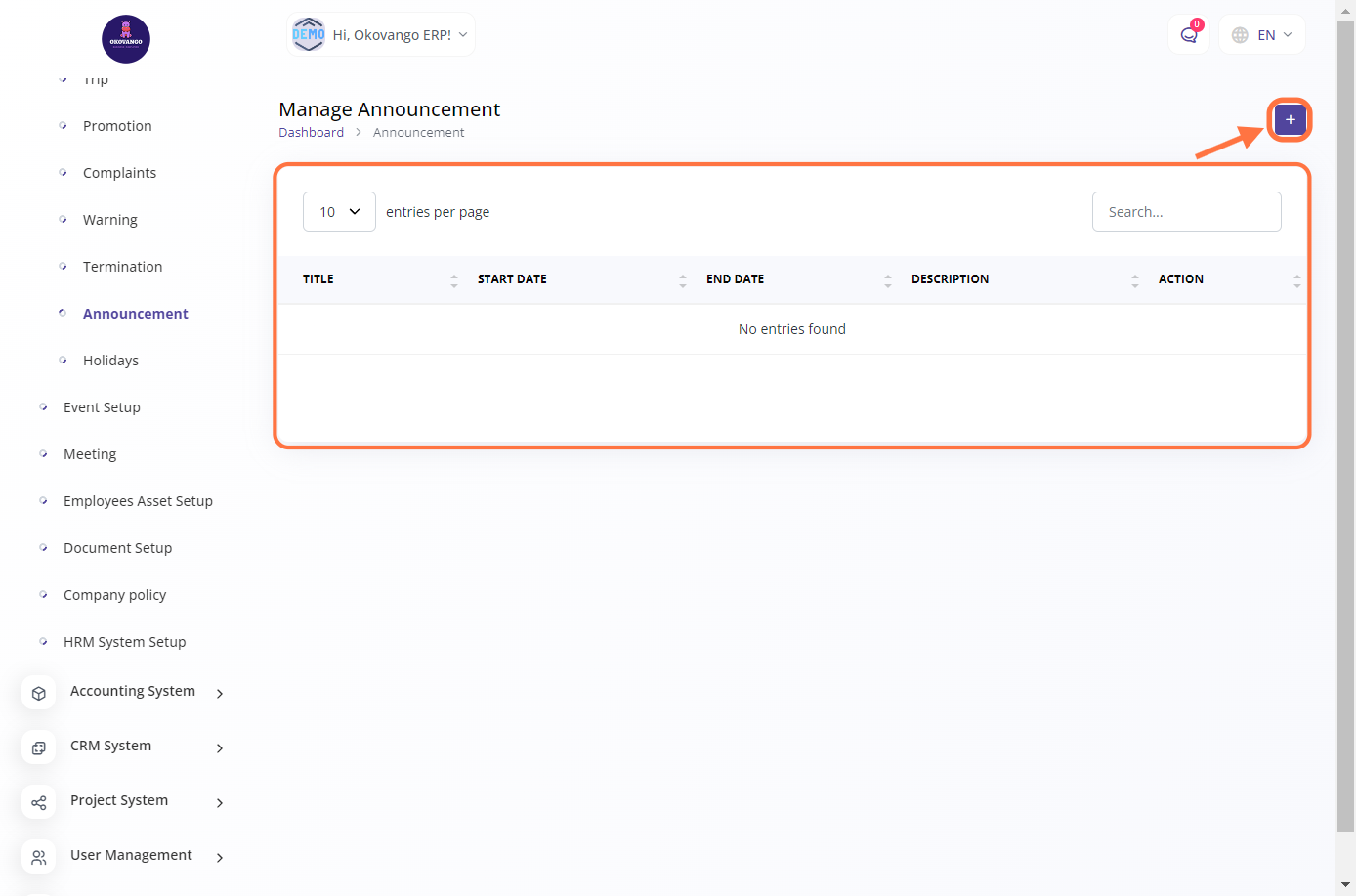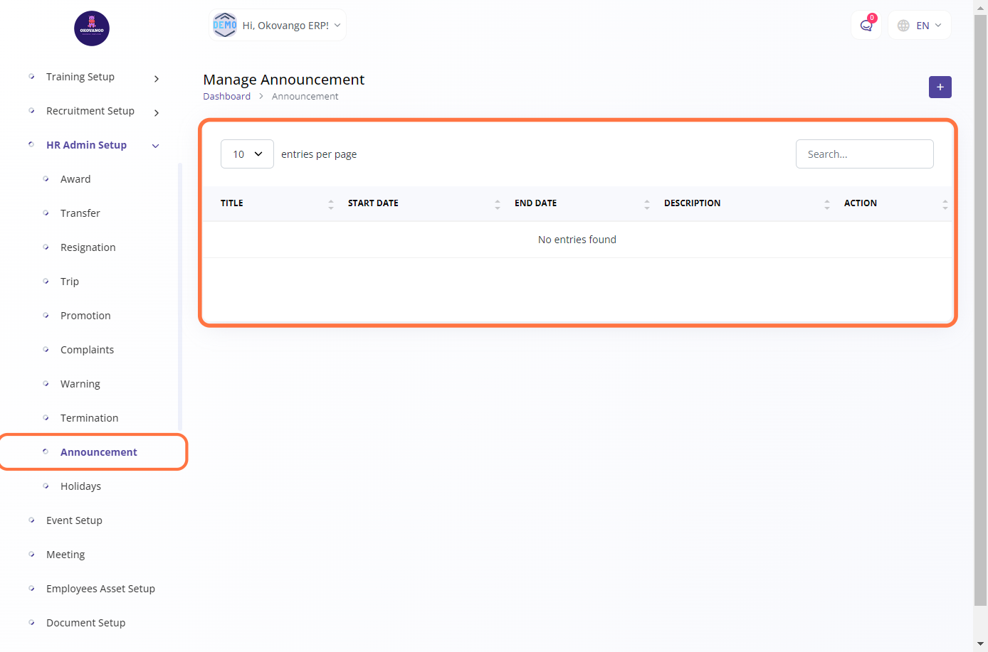 In the announcement management section, you can create and manage announcements for the organization. This feature allows you to share important information, updates, or news with employees. You can create an announcement by providing a title, selecting the target audience or recipients, setting the announcement date, and adding the announcement content. This helps in effectively communicating with employees, ensuring they are informed about important events, policy changes, or other relevant information.