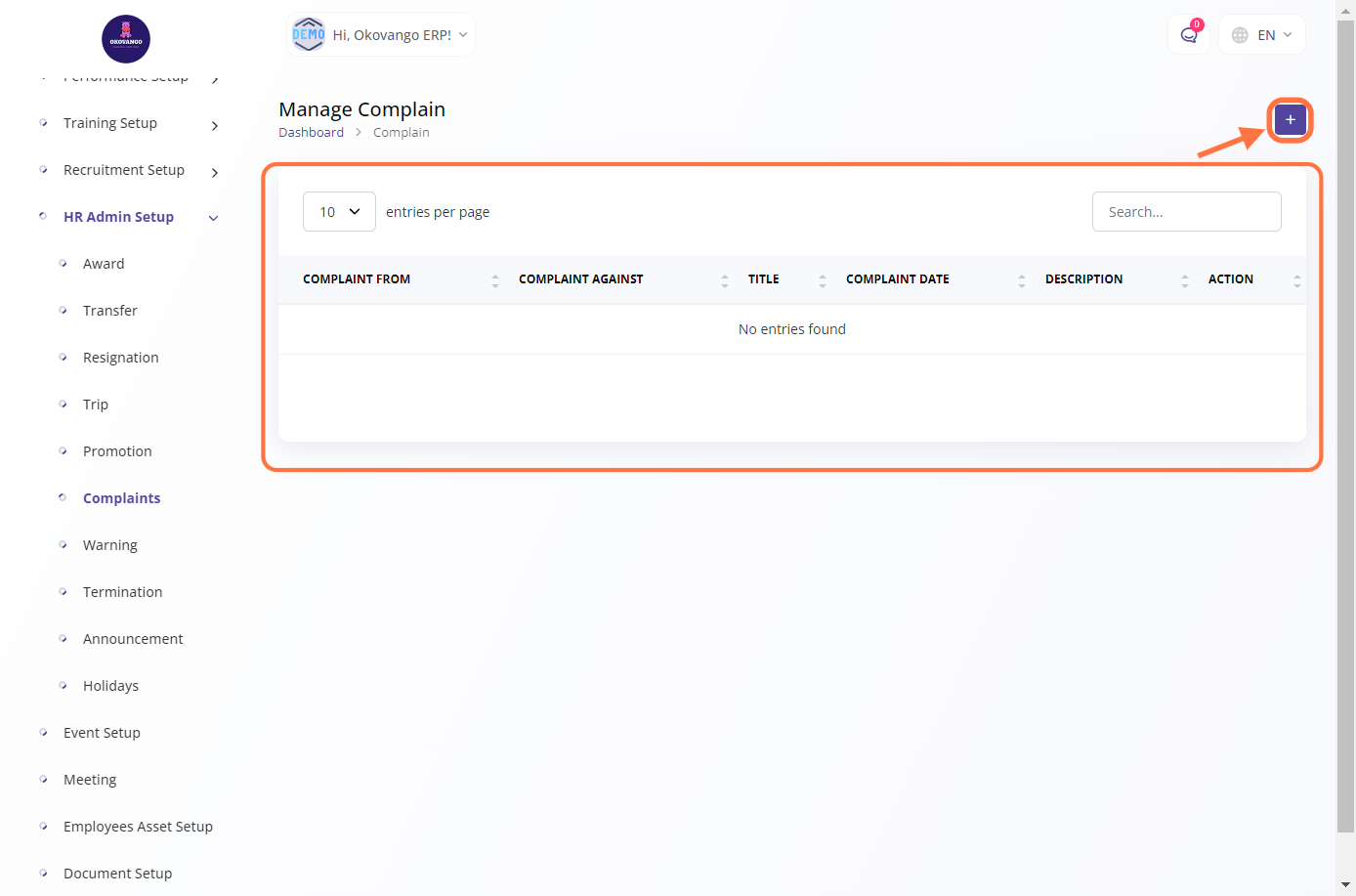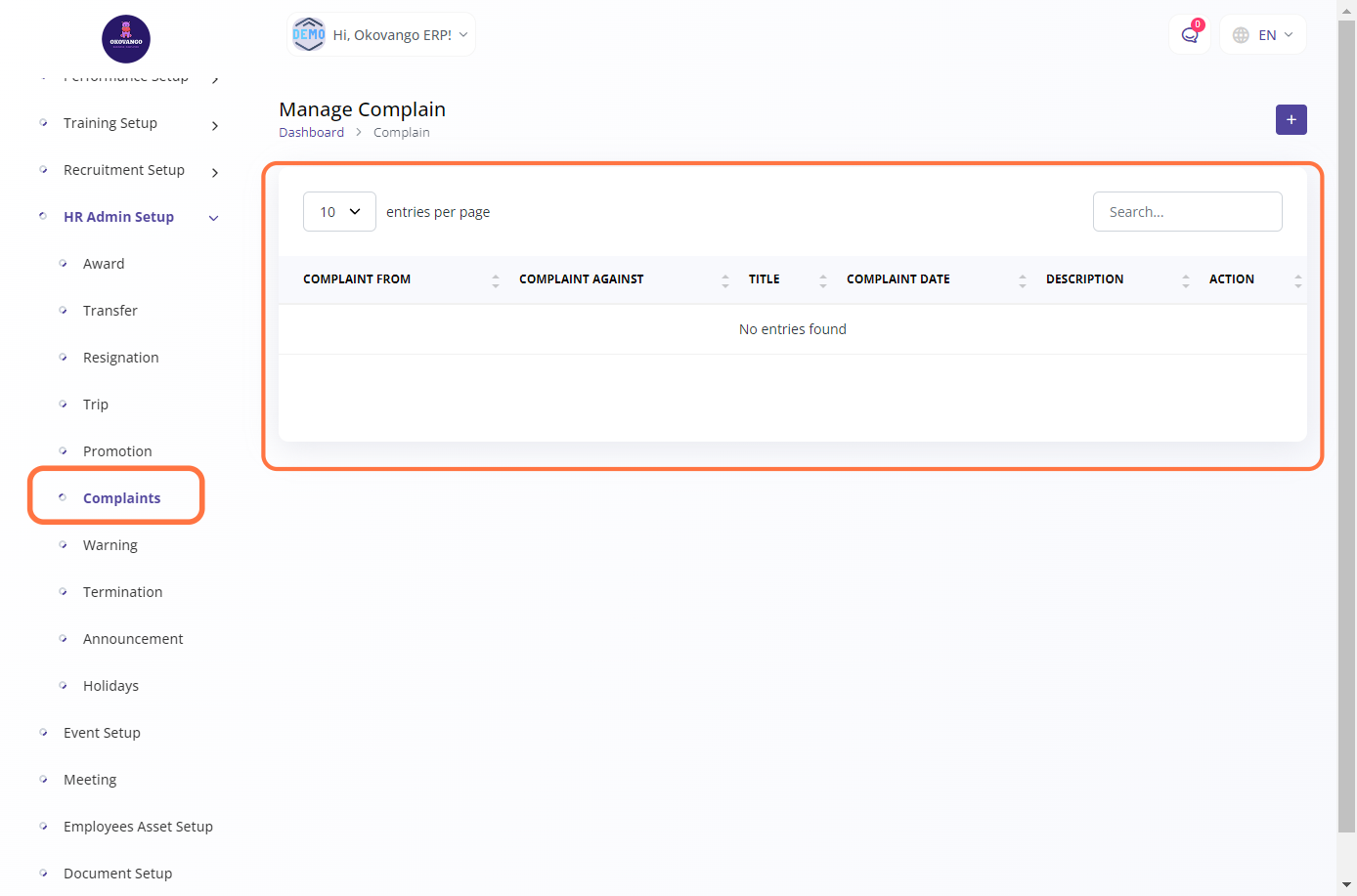 In the complaints management section, you can create and handle employee complaints within the organization. This feature provides a platform for employees to report grievances or concerns, ensuring a transparent and systematic process for addressing and resolving issues. You can enter the details of the complaint, such as the complainant's name, description of the complaint, date filed, and any supporting documents. This helps in effectively managing and addressing employee complaints, promoting a healthy work environment, and ensuring employee satisfaction.