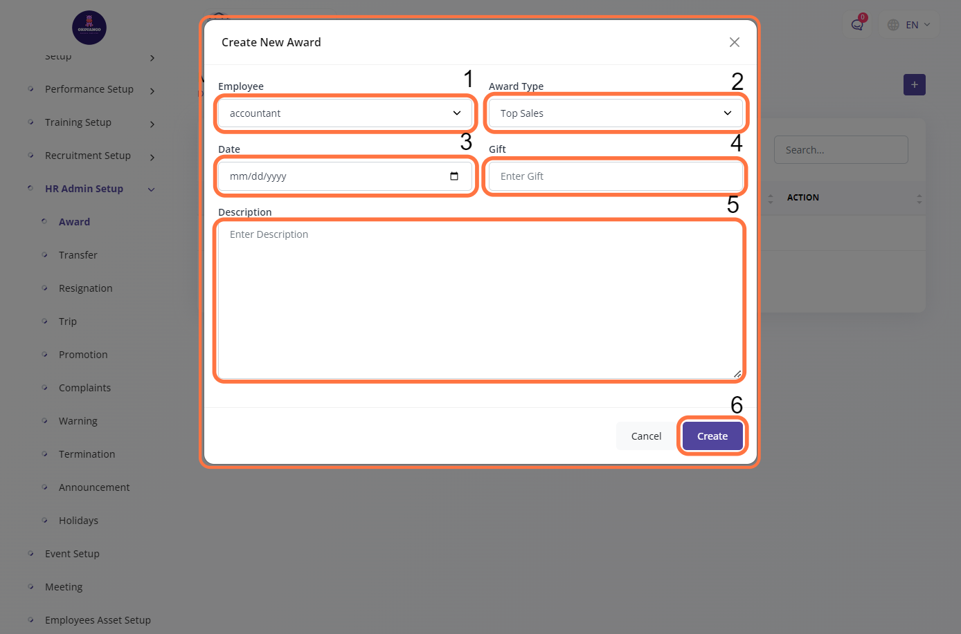 By following these steps, you can effectively set up an award, ensuring that it is attributed to the appropriate employee, with relevant details such as the award type, date, gift, and description.