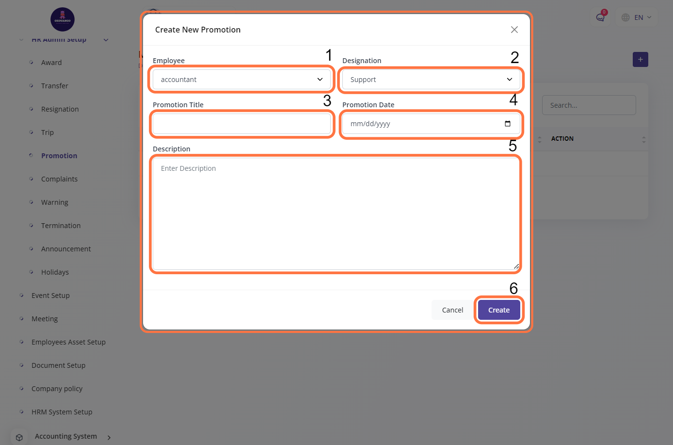 By following these steps, you can effectively set up a promotion, ensuring that the employee's new position, designation, and promotion details are accurately recorded, with relevant information such as the promotion title, promotion date, and description.