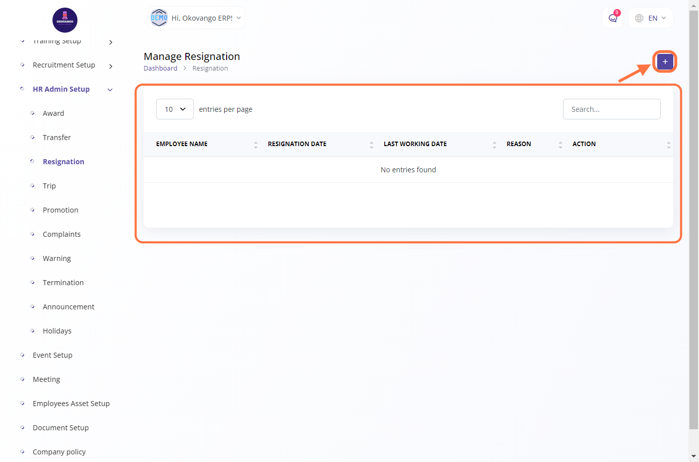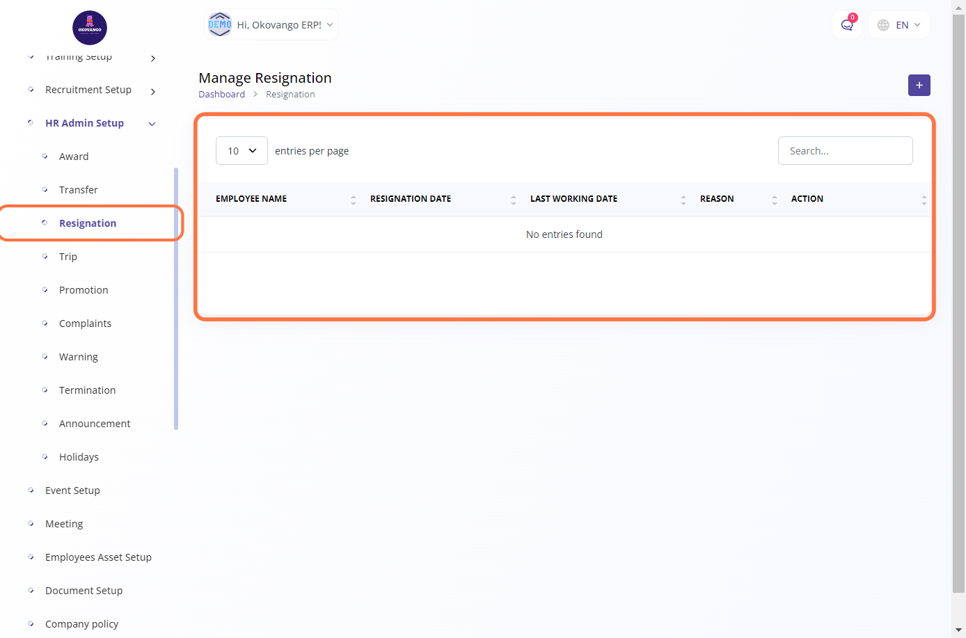 The resignation management section allows you to handle employee resignations within the organization. It provides a platform to process and manage employee resignations, ensuring a smooth transition and proper documentation. You can track resignation details, update employee records, and facilitate necessary processes such as exit interviews and clearance procedures. This feature helps streamline the resignation process and ensures effective communication and documentation between HR administrators and employees.