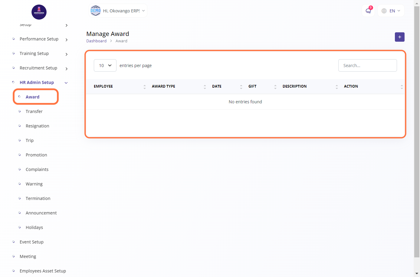 The award setup section allows you to define and configure awards within the organization. It provides a platform to create and manage various types of awards, such as recognition for outstanding performance or achievements. You can set up award criteria, nomination processes, eligibility requirements, and associated rewards or benefits. This feature enables you to streamline the award management process and ensure consistent recognition of employee contributions.