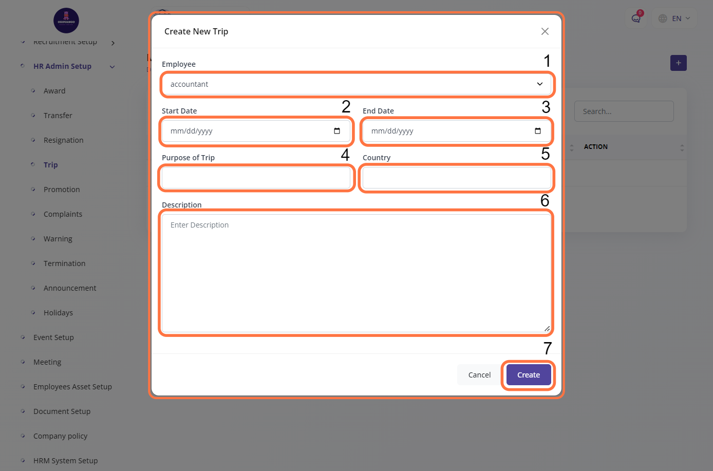 By following these steps, you can effectively set up a trip, ensuring that the employee's travel details are accurately recorded, with relevant information such as the start date, end date, purpose, destination, and description.