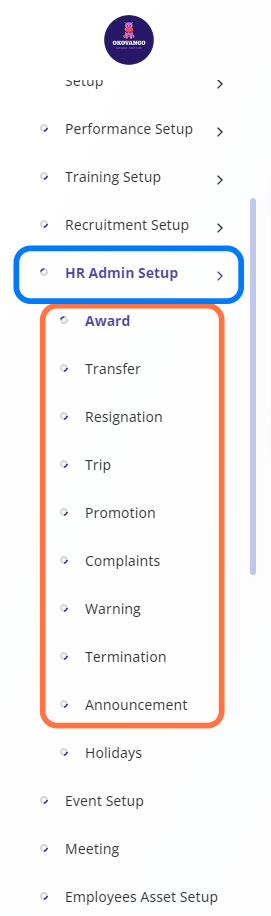 The HR Admin Setup section encompasses various aspects of HR management, including awards, transfers, resignations, trips, promotions, complaints, warnings, terminations, and more. It provides a centralized platform for handling these HR processes within the organization. HR administrators can utilize this section to efficiently manage and document employee-related activities and events. It streamlines HR workflows and ensures proper handling of important HR matters.