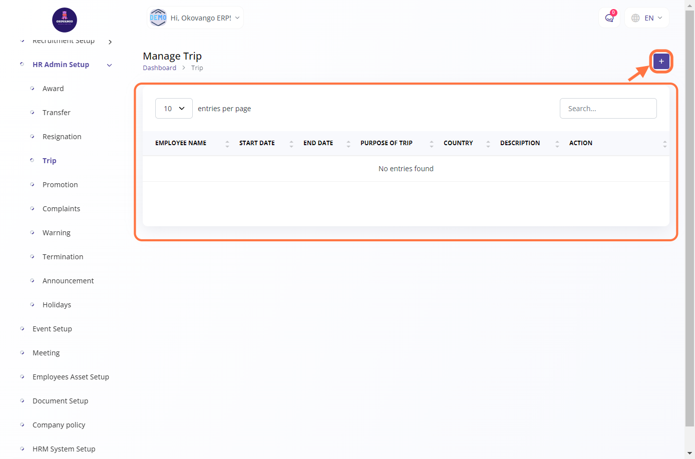 The trip management section allows you to handle employee trips or business travels within the organization. It provides a platform to manage and track trip requests, approvals, and associated details. You can enter trip information such as destination, purpose, duration, and expenses. This feature helps streamline the trip management process, ensures compliance with travel policies, and facilitates efficient coordination between employees and the HR department.