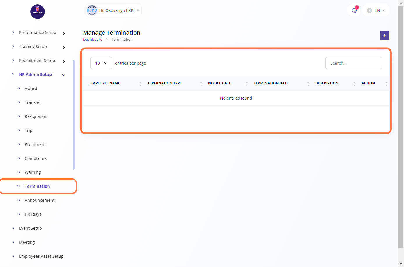 In the termination management section, you can create and manage terminations for employees within the organization. This feature allows you to document and process employee separations, including resignations, layoffs, or dismissals. You can specify the employee who is being terminated, select the termination type, provide a termination date, and include a description or reason for the termination. This helps in maintaining records of employment history, ensuring compliance with legal requirements, and managing the offboarding process effectively.