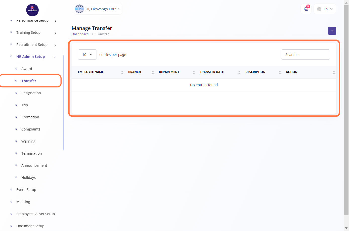 The transfer management section allows you to handle employee transfers within the organization. It provides a platform to initiate, track, and manage employee movements between different departments, branches, or locations. You can easily process transfer requests, update employee records, and ensure smooth transitions. This feature streamlines the transfer process and facilitates effective communication and coordination between departments and HR administrators.