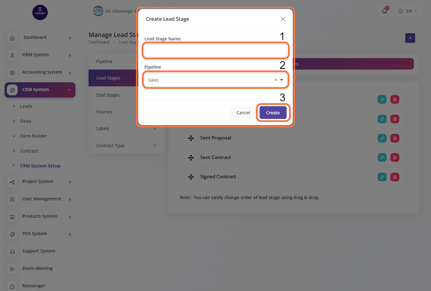 After clicking the create button, you can proceed to create new lead stages by following these steps: