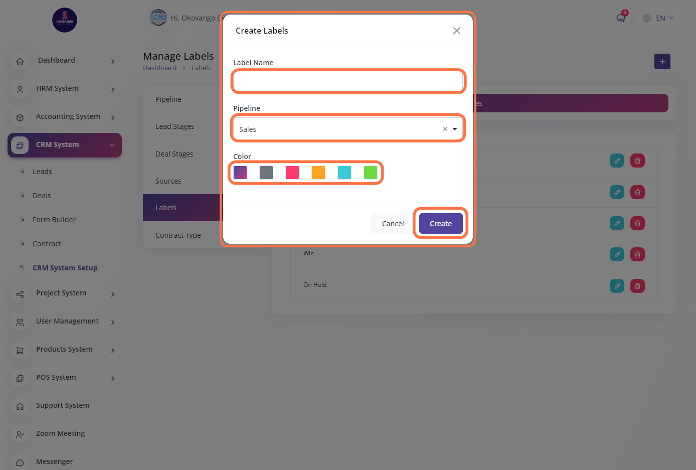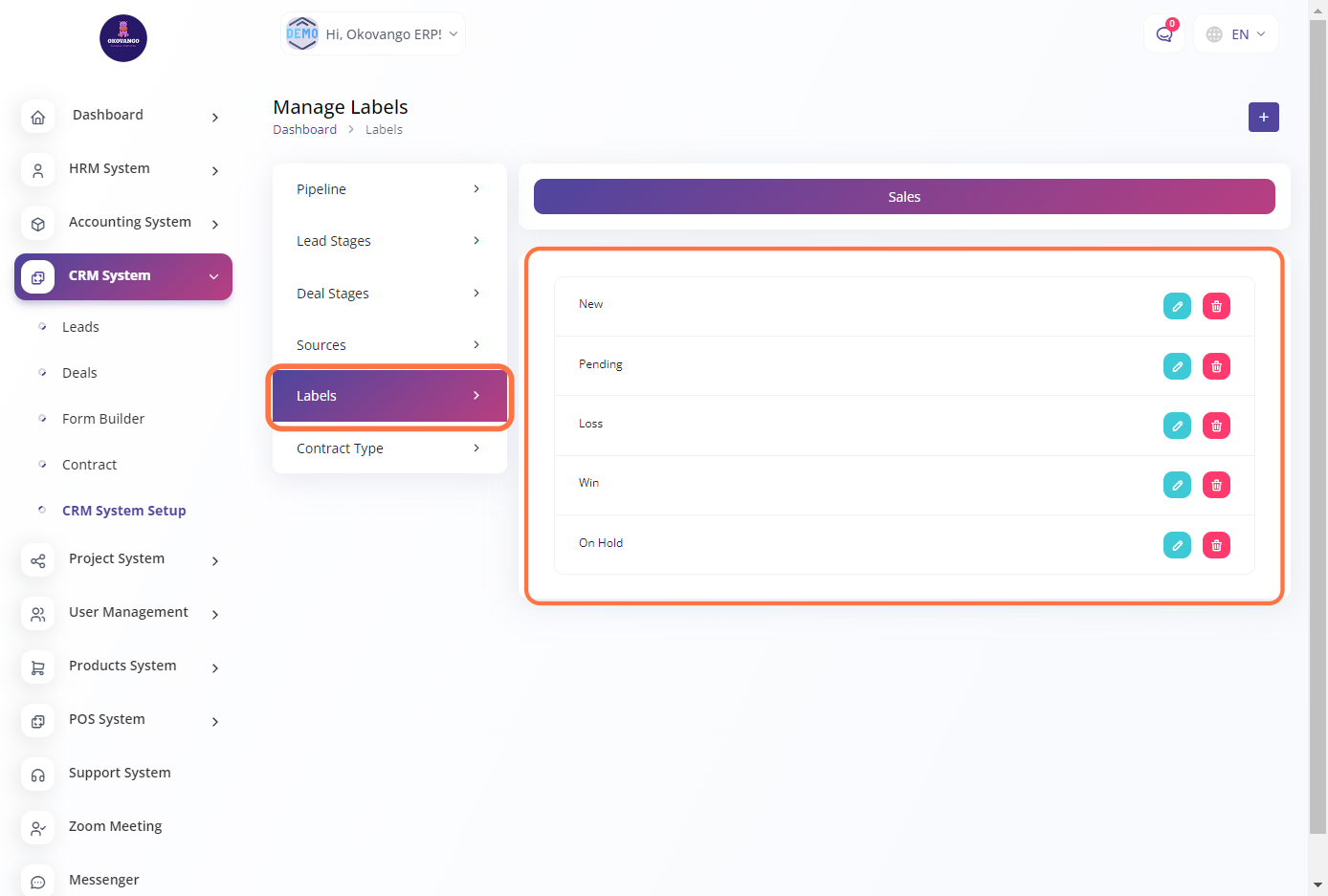 The CRM system allows you to manage and track interactions with your customers, leads, and prospects. You can set up various features and functionalities of the CRM system, such as contact Sales pipeline, Lead stages, deal stages, sources, labels and contract type. By customizing the CRM system to your organization's needs, you can enhance your customer relationships, streamline sales processes, and improve overall customer satisfaction.