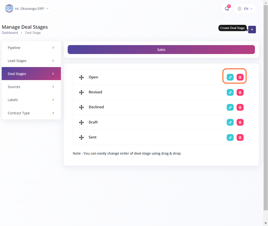 - Additionally, you have the flexibility to easily rearrange the order of deal stages by using the drag and drop feature. This allows you to customize the sequence of deal stages based on your specific workflow or business requirements.