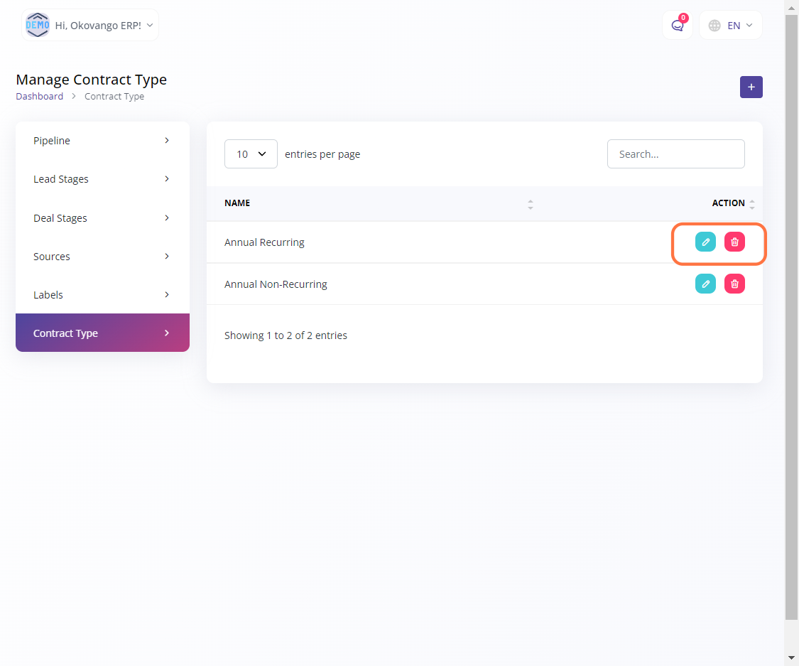 Once you have created a contract type, you have the flexibility to edit or delete it as needed. Editing the contract type allows you to modify its name or any other relevant details. This ensures that you can update the contract type information to accurately reflect your organization's evolving needs. Deleting a contract type removes it from the system, providing a way to remove outdated or no longer applicable contract types from your CRM setup. The ability to edit and delete contract types gives you control over managing and maintaining a streamlined and relevant contract type list in your CRM system.