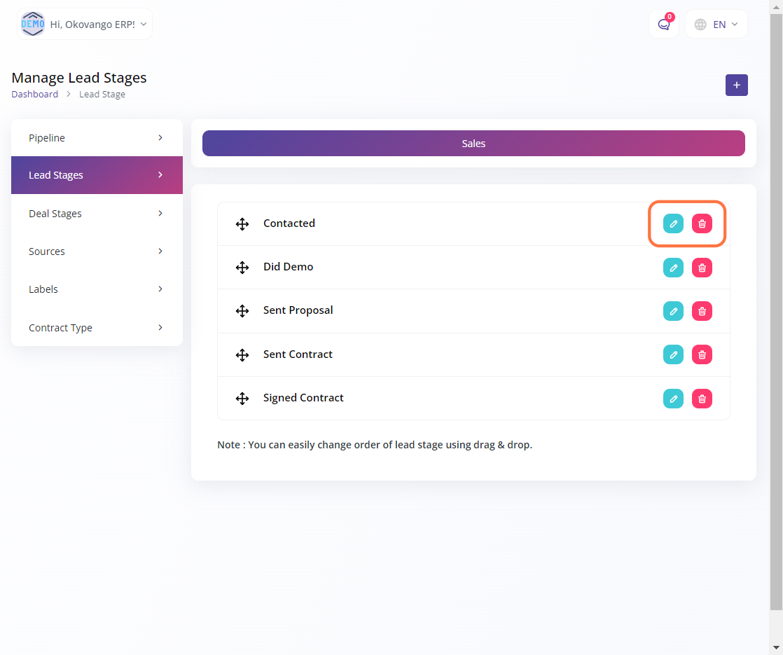- Please note that you can also easily change the order of lead stages by using the drag and drop functionality, allowing you to rearrange the stages according to your preferred sequence.