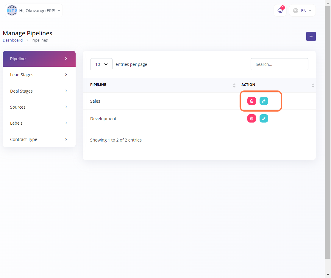 In this section, you can configure and set up your pipeline. The pipeline refers to the stages or steps involved in a particular process or workflow, such as sales, recruitment, or project management. By setting up the pipeline, you can define the various stages, statuses, or actions that need to be taken to move an item or task through the process. This allows for better organization, tracking, and management of your workflow, ensuring that tasks or items progress smoothly and efficiently from one stage to another.