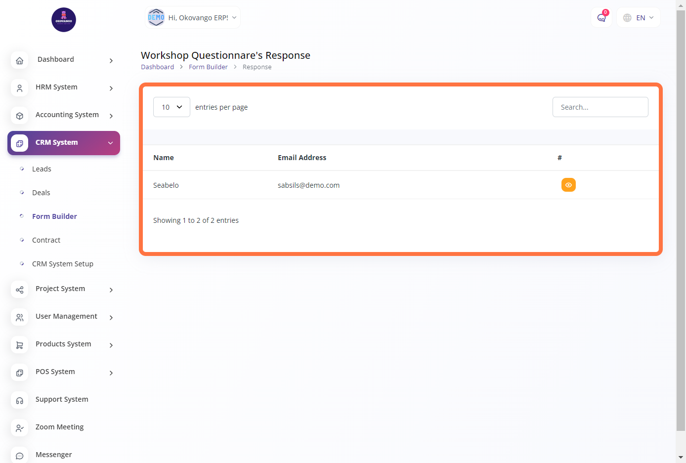 By selecting this option, you can view the responses and submissions received through the form, providing insights into customer interactions and data.
